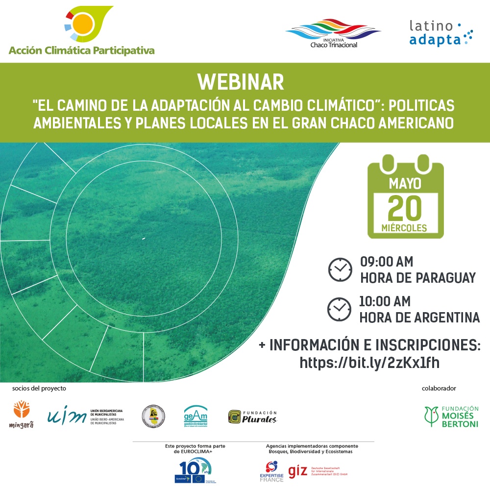 El foro virtual que inicia el próximo día miércoles 20 de mayo, con el webinar: "El camino de la adaptación al cambio climático: políticas ambientales y planes locales en el Gran Chaco americano", se enmarca en las acciones del proyecto #AcciónClimáticaParticipativa posible gracias al apoyo del Proyecto Latino Adapta y que cuenta con el financiamiento de la Unión Europea a través de Euroclima+.