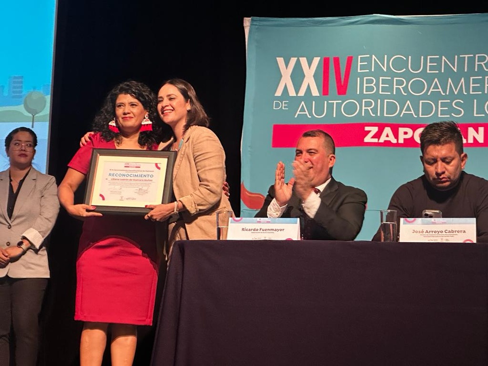 Por su parte, María Gomez Rueda, Coordinadora de Construcción de Comunidad del Ayuntamiento de Zapopan y Coordinadora local del XXIV Encuentro Iberoamericano de Autoridades Locales "Municipios e Infancias: Territorios confiables para niñas y niños", hizo entrega de un reconocimiento especial a Liliana Ladrón de Guevara Muñoz, quien operó como coordinadora representante de la UIM en esta iniciativa.