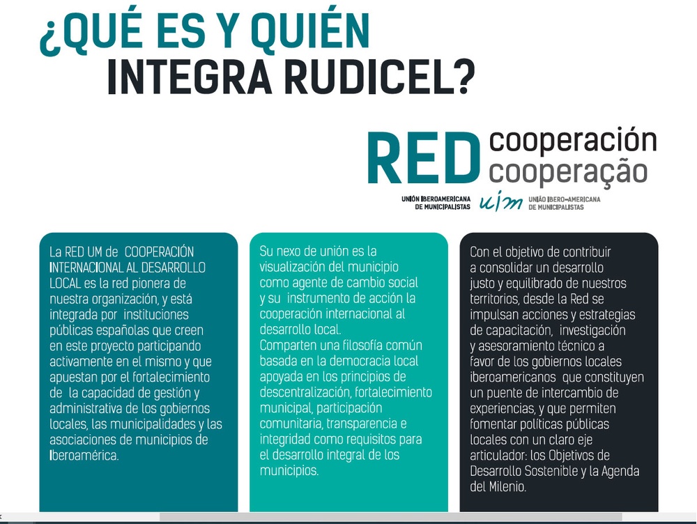 La RED UIM DE COOPERACIÓN INTERNACIONAL AL DESARROLLO LOCAL (RUDICEL) es la unión de entidades públicas españolas que trabajan de manera solidaria y comprometida en el apoyo para la capacitación, el intercambio de experiencias, la generación de alianzas y el desarrollo de líneas de investigación de directivos/as y autoridades pertenecientes a gobiernos locales de Iberoamérica.