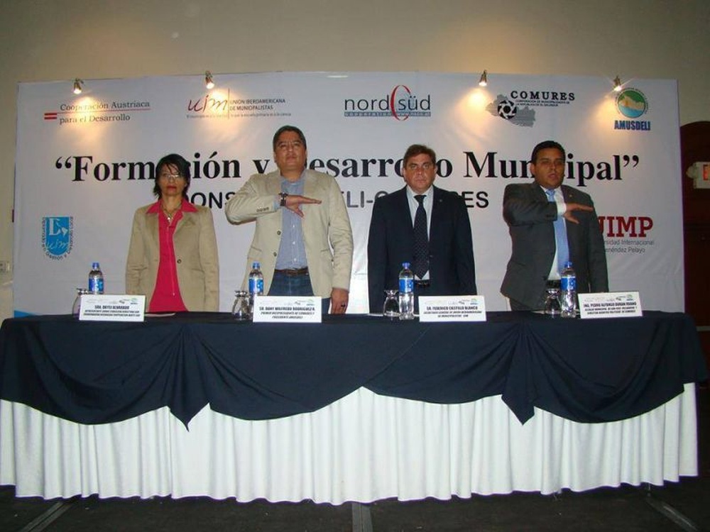 Con la presencia del Secretario General de la UIM, D. Federico Castillo Blanco, de D. Dany Rodríguez, Presidente de AMUSDELI, y Vice Presidente de COMURES, D. Pedro Durán, Alcalde Municipal de San José Villanueva y Dña Daisy Alvarado Ruiz, Consejera Directora de la UIM, y Coordinadora de la Cooperación Norte Sur, en Nicaragua, se realizó la solemne ceremonia de entrega de Diplomas y bandas de graduados a los alumnos que realizaron el Diplomado en Dirección y Gestión Pública UIM, en El salvador.