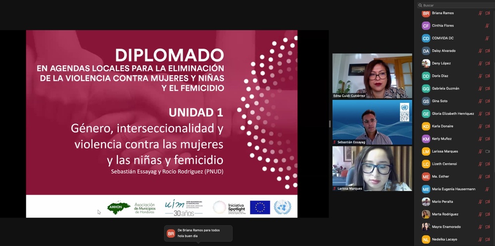 Con la clase teórica sincrónica "Generalidades sobre el Género, la interseccionalidad, la perspectiva de género y la violencia contra las mujeres y las niñas y el femicidio", han dado inicio las actividades académicas programadas en el Diplomado Agendas Locales para la Eliminación de la Violencia contra Mujeres y Niñas y el Femicidio, convocado gracias al trabajo en alianza de la Unión Iberoamericana de Municipalistas, el Programa de Naciones Unidas para el Desarrollo en Honduras (PNUD Honduras) y la Asociación de Municipios de Honduras, en el marco de la Iniciativa Spotlight, una alianza global entre la Unión Europea y las Naciones Unidas.