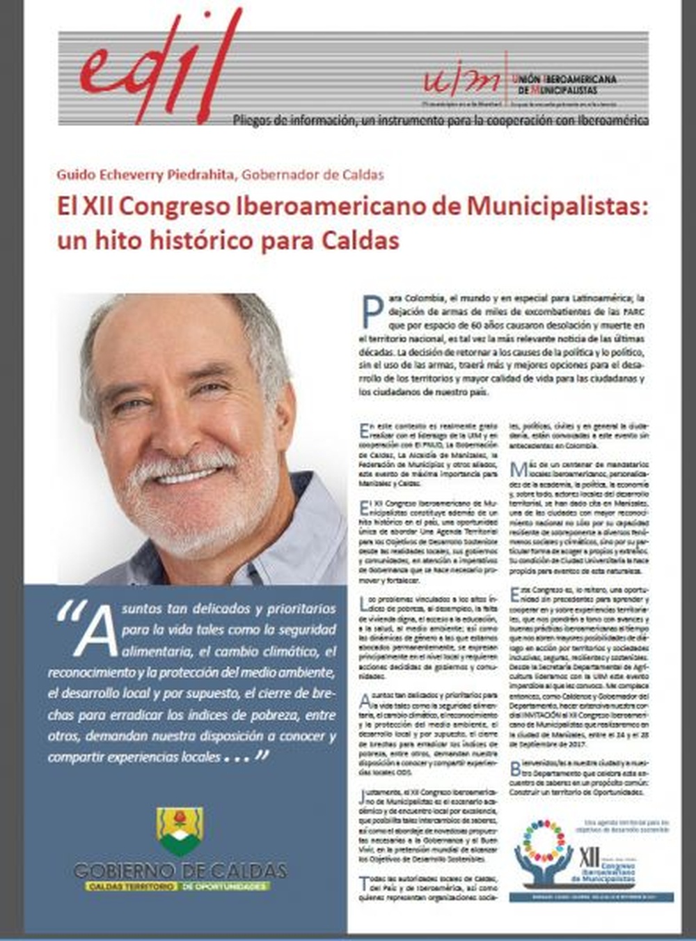 Con la editorial del Gobernador de Caldas, D. Guido Echeverri Piedrahita, invitando a los gestores y las gestoras públicas de Iberoamérica a sumarse al desafío de territorializar los ODS y a participar del XII Congreso Iberoamericano de Municipalistas que en el mes de septiembre se celebrará en Caldas Colombia, el Edil de este semestre vuelve a presentarse como un instrumento comunicacional que permite al lector estar al día de la gestión local que se está desarrollando en el espacio local de Iberoamérica.