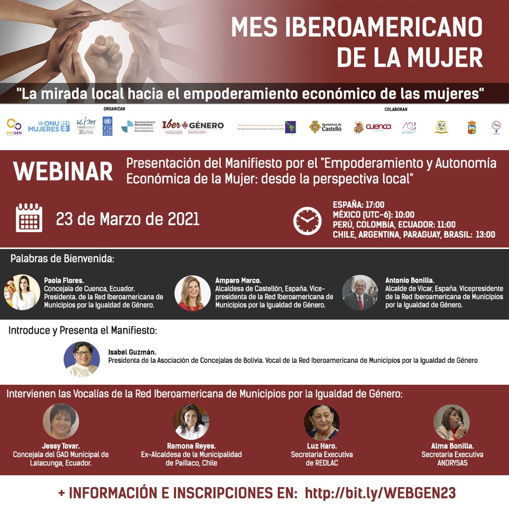 El próximo 23 de marzo, a las 17:00 horas de España, en el sistema online de eventos internacionales UIM, se llevará a cabo la celebración del webinar "Presentación del Manifiesto de la Red Iberoamericana de Municipios por la Igualdad de Género por el “Empoderamiento y Autonomía Económica de la Mujer”.