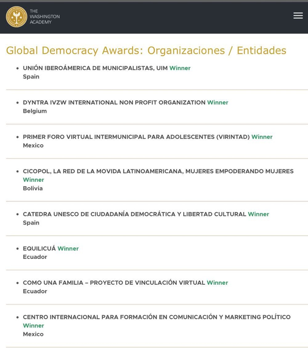 Por la trayectoria, el aporte a la cooperación internacional al desarrollo y la construcción de municipalismo en Iberoamérica, nuestra organización será reconocida en su 30 aniversario con la concesión del Premio GLOBAL DEMOCRACY AWARDS. La gala de celebración y entrega de la estatuilla, se realizará el día 17 de noviembre, en el Arlington Campus de la George Mason University.