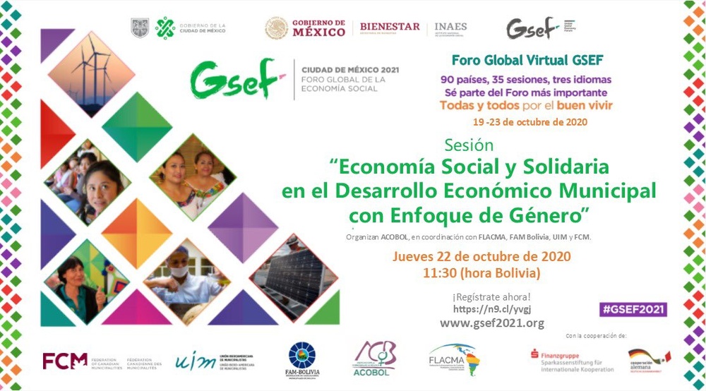 En este sentido, en el marco del Foro Virtual Global 2020 se desarrollarán diversas sesiones regionales (auto organizadas) que abordarán distintas temáticas relacionadas al modelos de Economía Social y Solidaria y su impacto positivo en el desarrollo local. Por ello la Asociación de Concejalas de Bolivia (ACOBOL) como miembro del GSEF y en colaboración con la Federación Latinoamericana de Ciudades, Municipios y Asociaciones de Gobiernos Locales (FLACMA), la Federación de Asociaciones Municipalistas de Bolivia (FAM), y la Unión Iberoamericana de Municipalistas, impulsan la “Sesión de Economía Social y Solidaria en el Desarrollo Económico Municipal con enfoque de Género”, cuyo objetivo principal es promover el diálogo, intercambio de buenas prácticas y el aprendizaje mutuo entre autoridades locales, expertos (as), Sociedad Civil Organizada, Directivos (as) de Asociaciones Municipalistas Latinoamericanas.