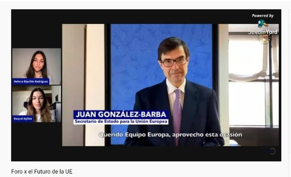 D. Juan González- Barba, Secretario de Estado para la Unión Europea de España invitó a la participación activa de los jóvenes en la Conferencia a través de la creación de nuevas herramientas “quiero animaros a participar en la Plataforma digital que se ha creado y se va a lanzar el 19 de abril. Vuestra voz juvenil es una voz imprescindible de la sociedad civil, para contribuir con propuestas innovativas, con propuestas europeístas y con propuesta con vocación de futuro en este debate que nos implica a todos los europeos”.