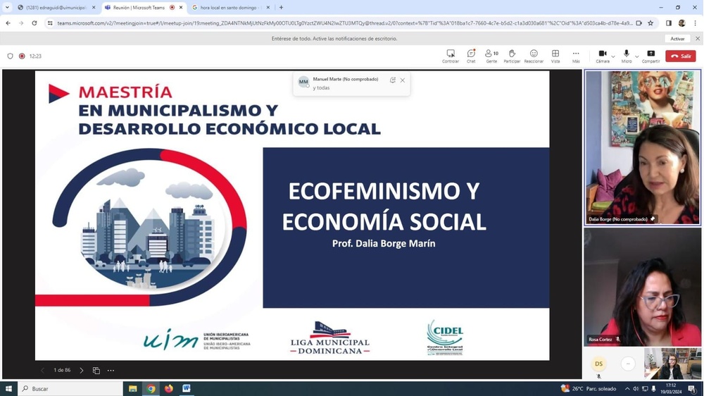 La clase sobre Ecofeminismo y Economía Social, brindó en el marco de la Maestría en Municipalismo y Desarrollo Económico Local, que desarrolla en alianza la Unión Iberoamericana y la Liga Municipal Dominicana, herramientas que permitirán al alumnado una visión integral y nuevas miradas frente al tema de la sostenibilidad y avance de las mujeres para la equidad y cohesión en igualdad.