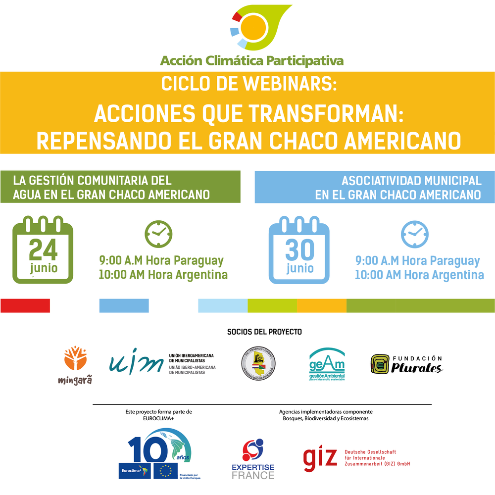 El ciclo de foros virtuales “Acciones que transforman: repensando el Gran Chaco” impulsado desde el Proyecto Acción Climática Participativa, financiado por la Unión Europea, en el marco del trabajo liderado por Euroclima+, convoca junto a sus socios estratégicos dos actividades que se desarrollarán bajo el formato de videoconferencias.