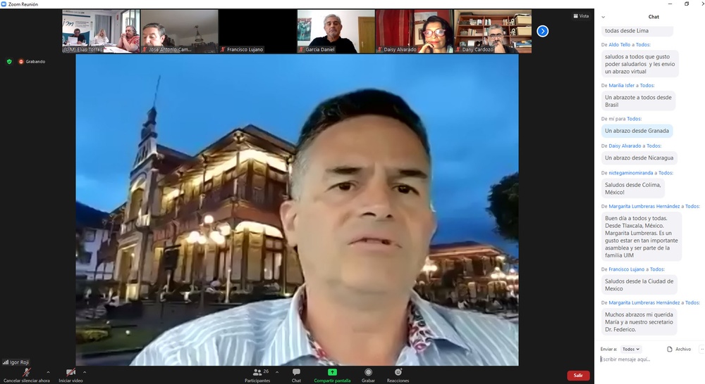 Agradecemos a la familia UIM conectada desde toda Iberoamérica y muy en especial al Presidente UIM, Guido Echeverri que ha participado en esta fase de la reunión conectado desde Colombia y que ha estado acompañado por el Consejero UIM por Perú, Saúl Barrera y la Consejera Directora por Venezuela, Zulma Bolivar.