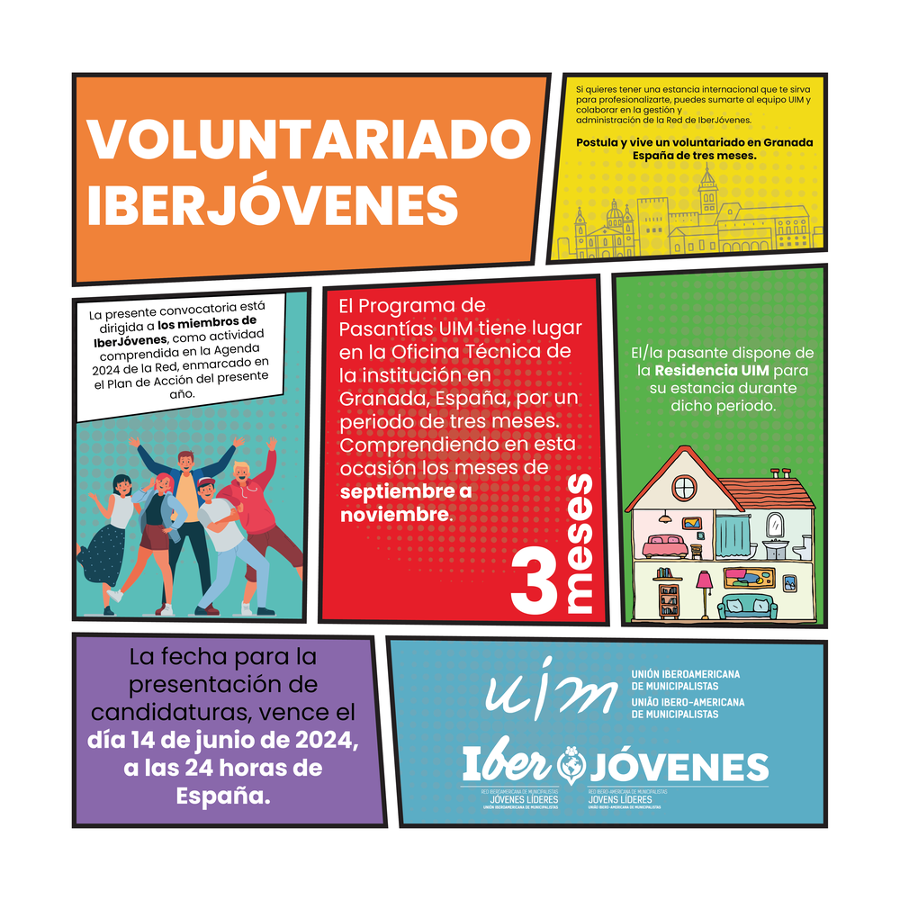 El Voluntariado IberJóvenes, ofrece a estudiantes y graduados de América Latina una oportunidad de profesionalización en la administración pública y cooperación internacional, colaborando con la UIM en su oficina técnica de Granada, España. Con una duración de tres meses, el programa incluye alojamiento gratuito y es una oportunidad de sumar a la RED de Jóvenes de la UIM.