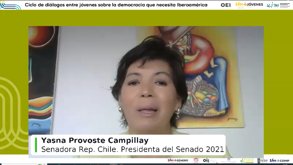 El diálogo estuvo moderado por Chandel Dávila Gutiérrez, coordinadora de Educación y Cultura de la OEI en México, quien condujo de forma brillante el espacio de participación de los 12 líderes juveniles iberoamericanos intervinientes, al que se unió la senadora Yasna Provoste y el resto de participantes de este espacio realizando sus aportaciones.