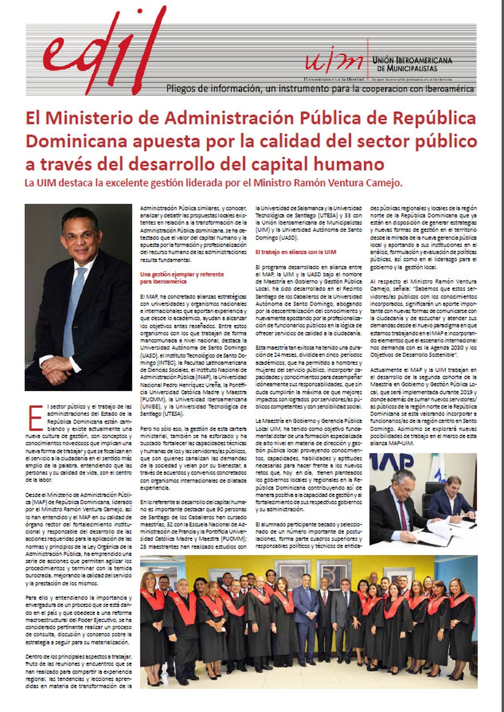 Esta nueva entrega del periódico el "Edil" dedica su portada al trabajo de excelencia que se está desarrollando en el sector público a través de la gestión del Ministerio de Administración Pública de República Dominicana y que sin duda, se convierte en una experiencia replicable a otras naciones de Iberoamérica.