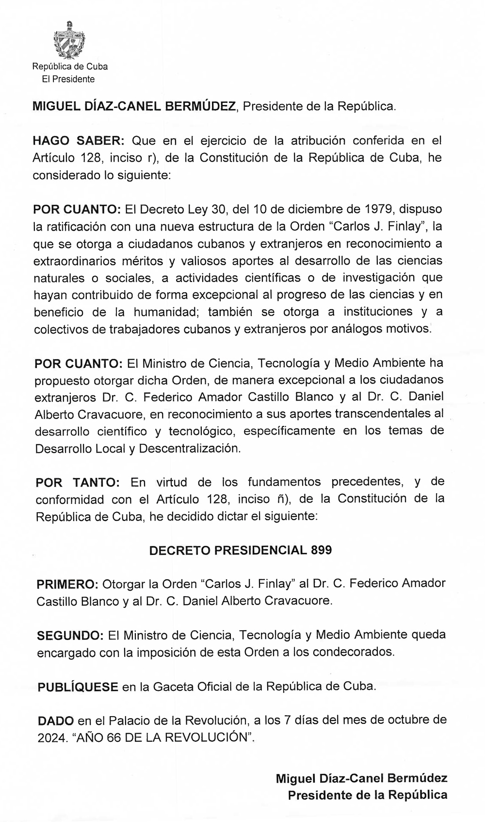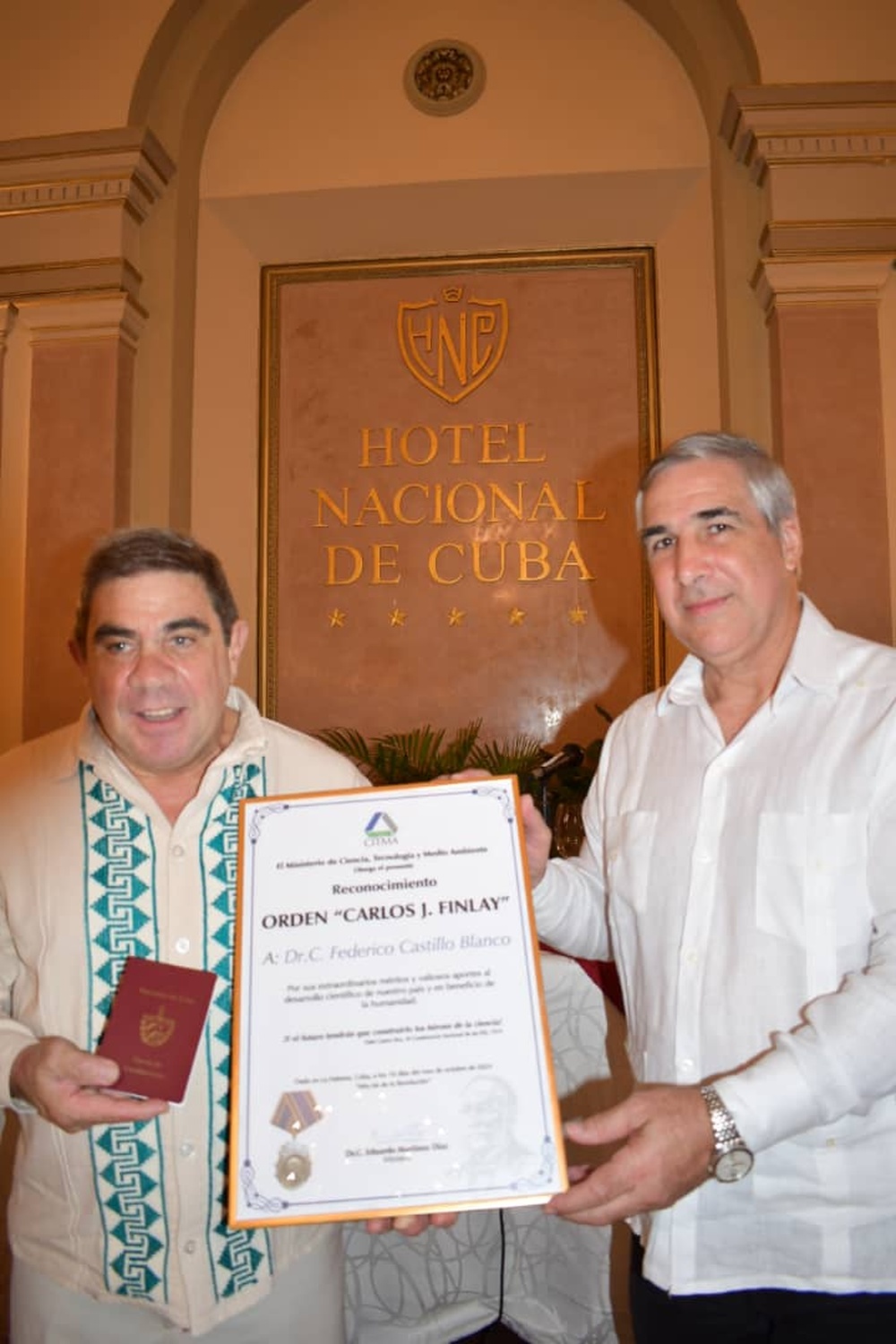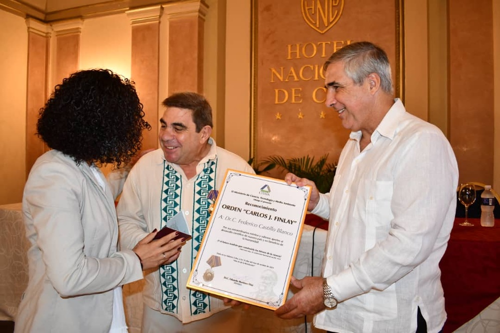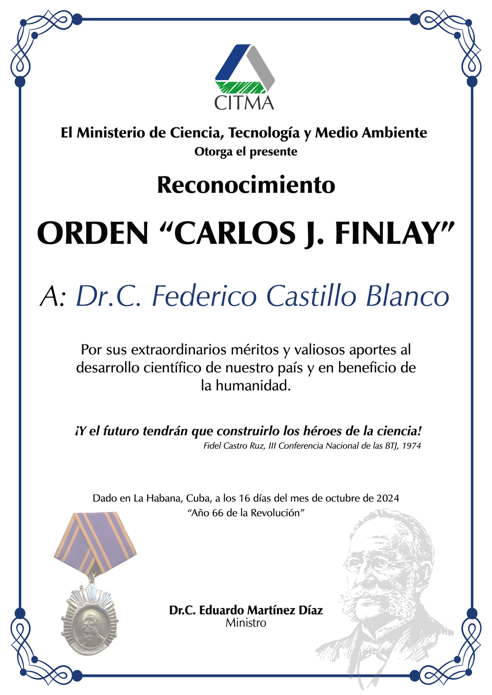 Este prestigioso galardón, que rinde homenaje a los méritos y aportes al desarrollo de las ciencias naturales y sociales, fue entregado al Dr. Castillo Blanco por el Ministro de Ciencia, Tecnología y Medio Ambiente de Cuba, Dr. Eduardo Martínez Díaz, en una ceremonia que se realizó tras un Decreto Presidencial firmado por el Presidente de la República de Cuba, Miguel Díaz-Canel Bermúdez.