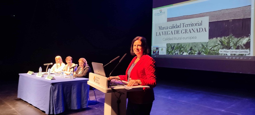 Durante la apertura, se presentó la experiencia “Marca La Vega de Granada”, a cargo de Dña. M. Pilar Gámiz Cerrillo, Gerente de la Asociación Promovega Sierra Elvira, quien expuso el proceso de creación e implementación de una marca territorial basada en la Calidad Rural Europea. Este distintivo fortalece la identidad del medio rural, integrando empresas, instituciones y productores de la comarca Vega–Sierra Elvira bajo un sello de calidad territorial y sostenibilidad.
