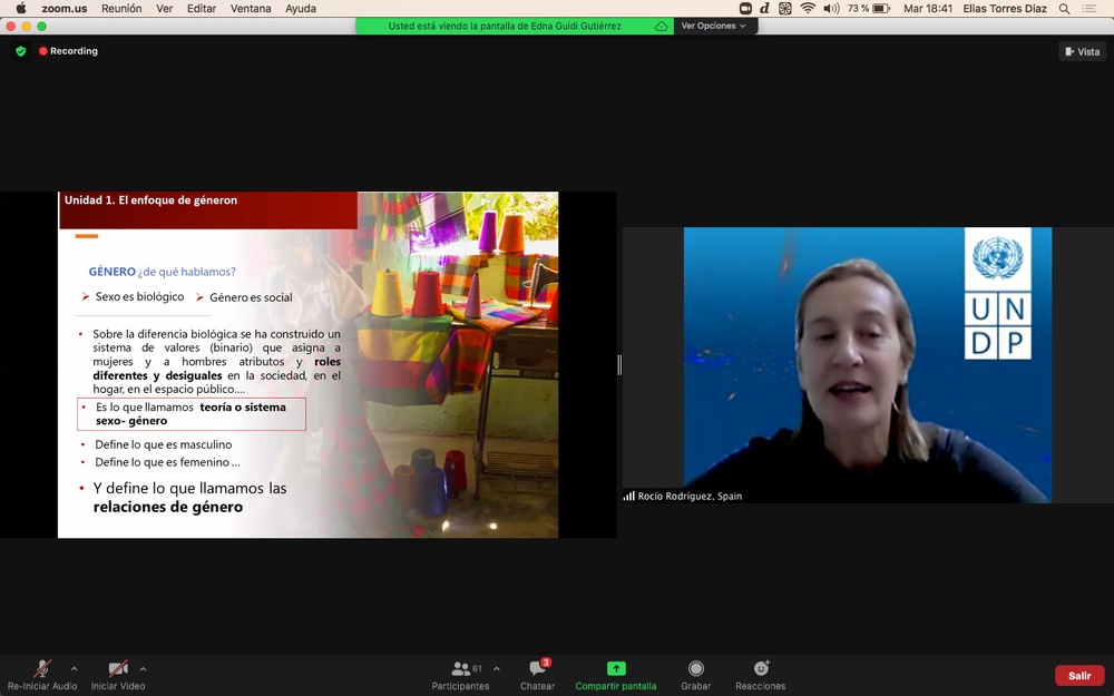 La facilitadora de esta primera jornada ha sido la especialista en género y violencia contra las mujeres y niñas del Cluster de Género del Centro Regional de PNUD, Rocío Rodríguez, quien impartió en directo su clase teórica, destinada a analizar las nociones y concepciones del género, la interseccionalidad y la violencia contra las mujeres a partir de las construcciones sociales, culturales e institucionales y las particularidades y desafíos normativos y de política pública en Honduras.