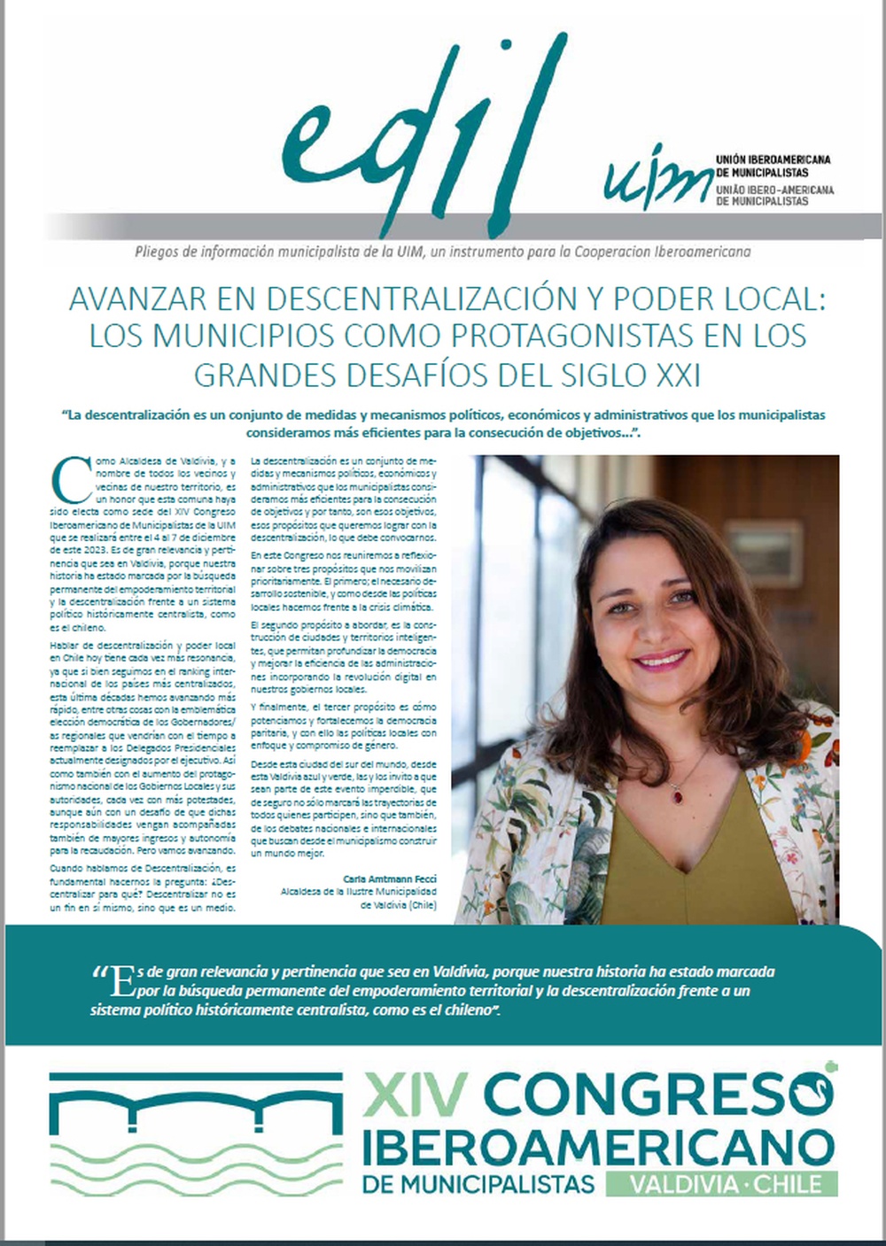 La portada del periódico, ofrece una columna de opinión de la anfitriona del evento, la alcaldesa de Valdivia, Carla Amtmann Fecci, donde reflexiona sobre la temática central del Congreso “Tres décadas de descentralización en Iberoamérica: balances y desafíos desde el municipalismo”.