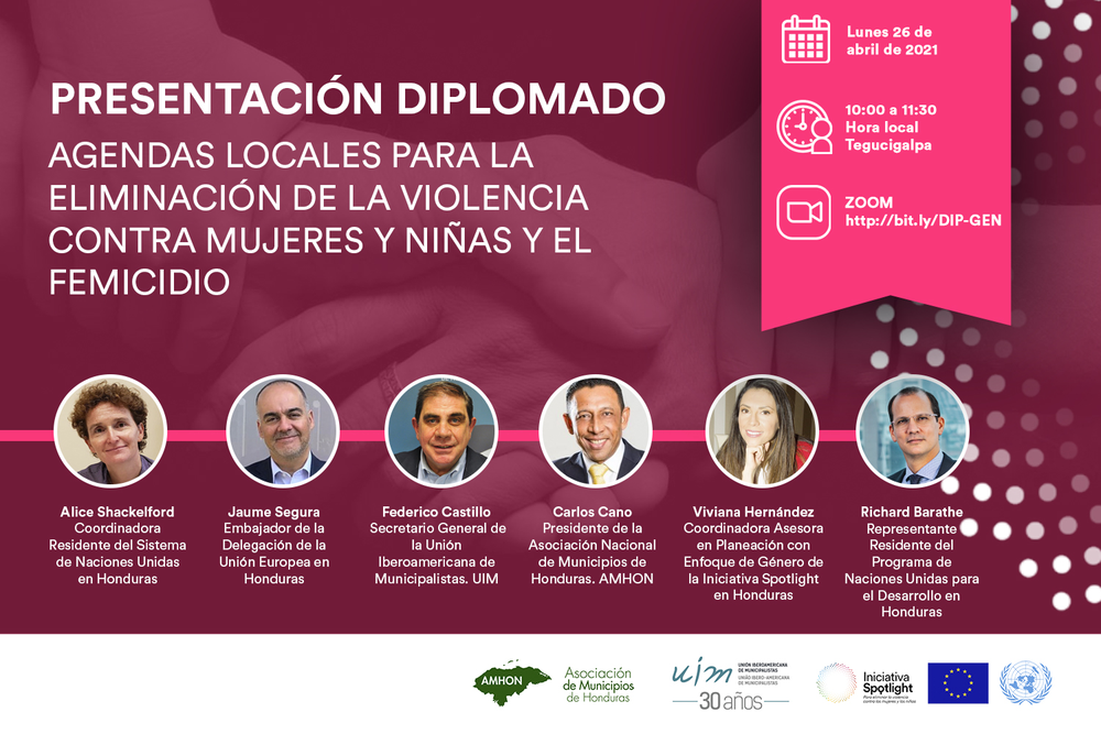 El Diplomado es convocado de forma conjunta por la Delegación de la Unión Europea en Honduras, PNUD Honduras, la Unión Iberoamericana de Municipalistas y la Asociación de Municipios de Honduras, en el marco de la Iniciativa Spotlight.