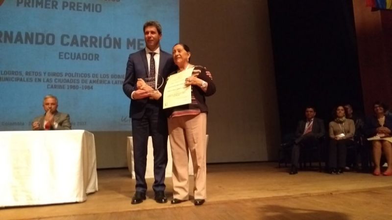 En esta categoría de Premios UIM, ha recibido el PRIMER PREMIO, el trabajo: “LOGROS, RETOS Y GIROS POLÍTICOS DE LOS GOBIERNOS MUNICIPALES EN LAS CIUDADES DE AMÉRICA LATINA Y EL CARIBE, 1980-1984”- FERNANDO CARRIÓN MENA, ECUADOR ( Profesor Investigador FLACSO-ECUADOR), quien no ha podido estar presente en la ceremonia y ha mandado un video/saludo de agradecimiento por la distinción lograda.