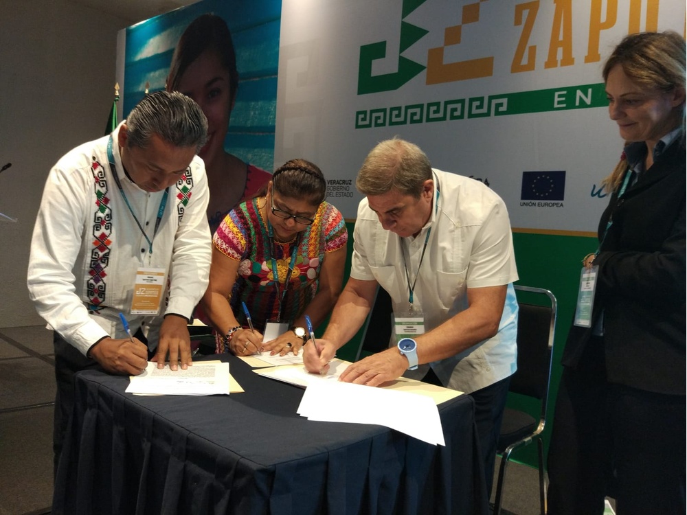 En la imagen la firma del convenio entre las autoridades locales, destacando la importante presencia de María Isela López Álvarez. Presidenta Municipal de Santiago Sochiapan, cuyo compromiso junto al del Alcalde de Playa Vicente, Urbano Bautista, permitirán que los frutos de este trabajo queden para siempre en el territorio.