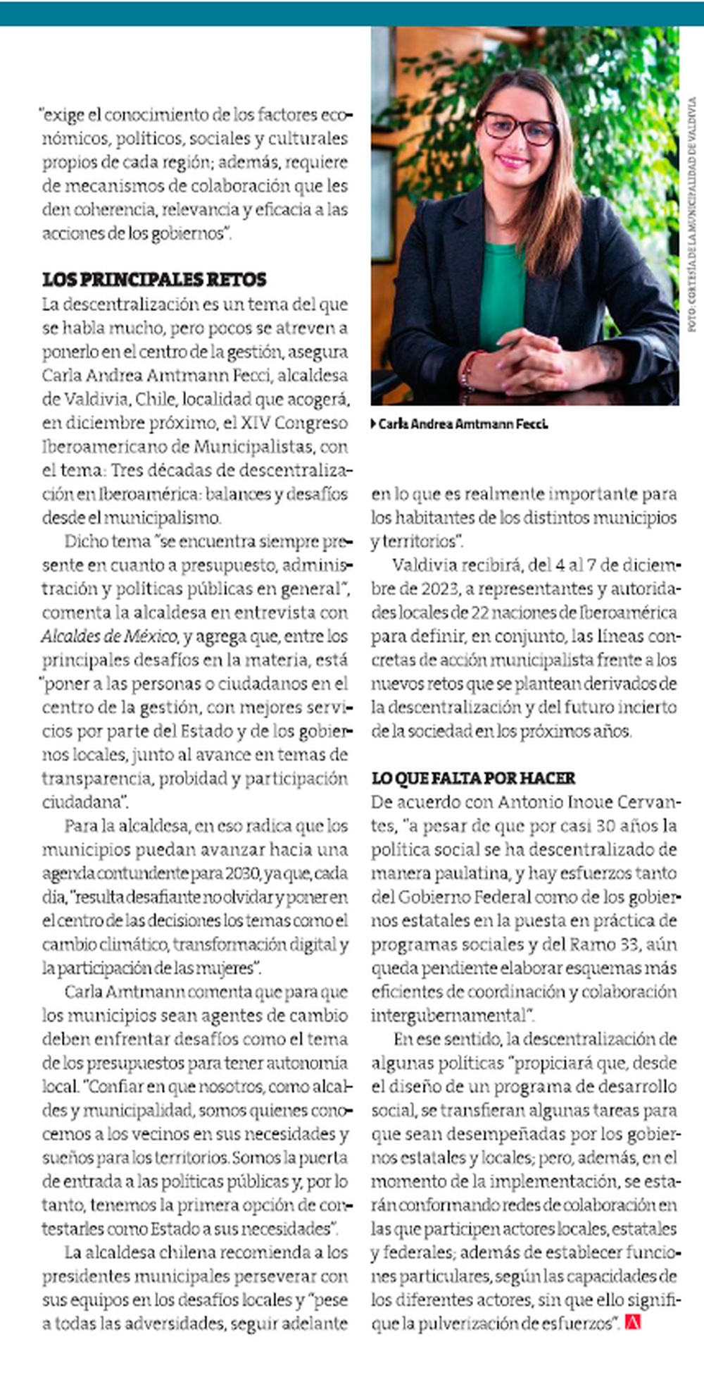 Para conocer detalles de la gestión encabezada por la primera mujer en asumir el cargo de alcaldesa en la ciudad de Valdivia, la Revista Alcaldes de México, en su calidad de medio colaborador de la Unión Iberoamericana de Municipalistas, ha realizado una nota titulada "Cómo enfrentar las nuevas responsabilidades municipales"