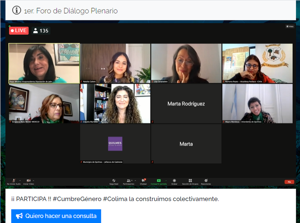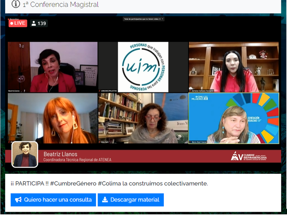 La V Cumbre Iberoamericana de Agendas Locales de Género, que se desarrolla completamente online, es organizada por la Unión Iberoamericana de Municipalistas (UIM), en conjunto con el Gobierno del Estado de Colima, el Consejo de Ciencia y Tecnología del Estado de Colima (CECYTCOL), el Instituto Electoral del Estado de Colima, ONU Mujeres, el Programa de Naciones Unidas para el Desarrollo (PNUD), la Secretaría General Iberoamericana (SEGIB) y la Comisión Interamericana de la Mujer de la OEA.
