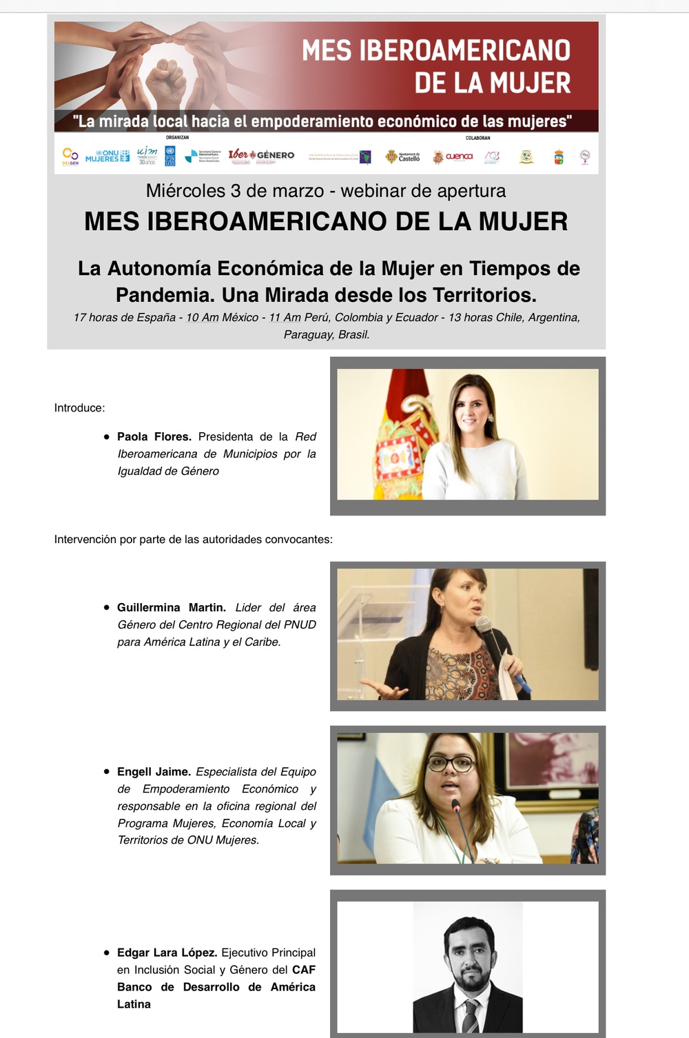 La alianza de la UIM, a través de su Red Iberoamericana de Municipios por la Igualdad de Género, La Secretaría General Iberoamericana (SEGIB), ONU Mujeres , PNUD y CAF, posibilitarán diversas iniciativas enmarcadas en Mes Iberoamericano de la Mujer, que inicia este 3 de marzo, con un webinar destinado a reflexionar sobre la importancia del empoderamiento de la mujer desde la mirada local.