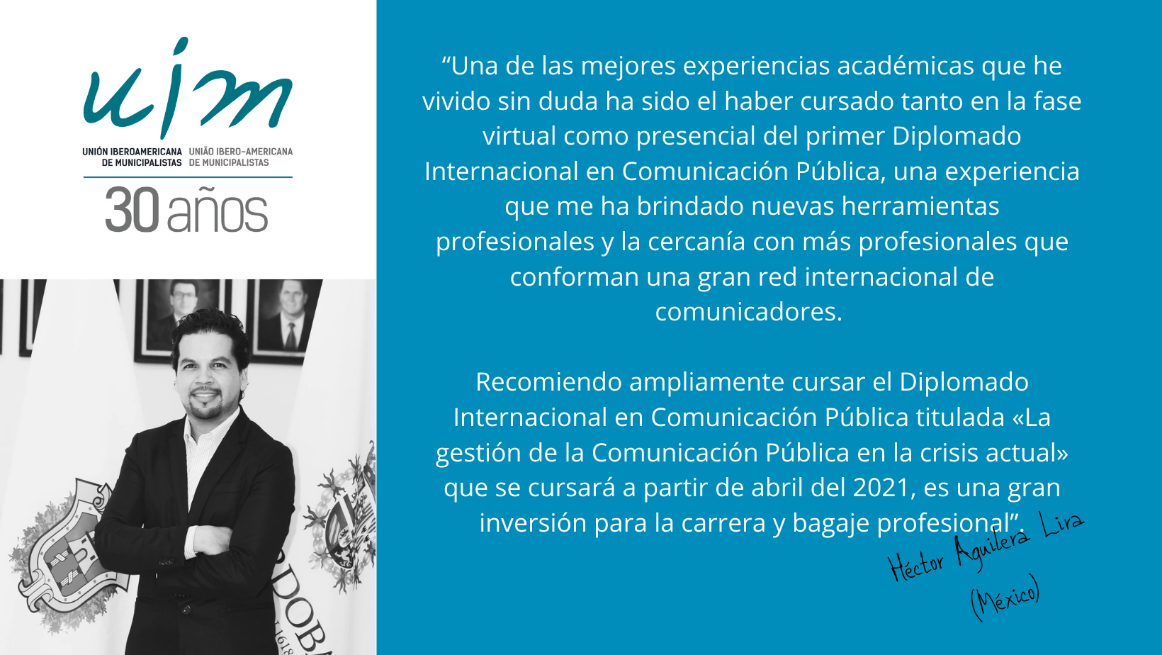 Héctor Aguilera Lira, Licenciado y especialista en comercio exterior por la Universidad Veracruzana (México) afirma que “Una de las mejores experiencias académicas que he vivido sin duda ha sido el haber cursado tanto en la fase virtual como presencial del primer Diplomado Internacional en Comunicación Pública, una experiencia que me ha brindado nuevas herramientas profesionales y la cercanía con más profesionales que conforman una gran red internacional de comunicadores. Recomiendo ampliamente cursar el Diplomado Internacional en Comunicación Pública titulada «La gestión de la Comunicación Pública en la crisis actual» que se cursará a partir de abril del 2021, es una gran inversión para la carrera y bagaje profesional”